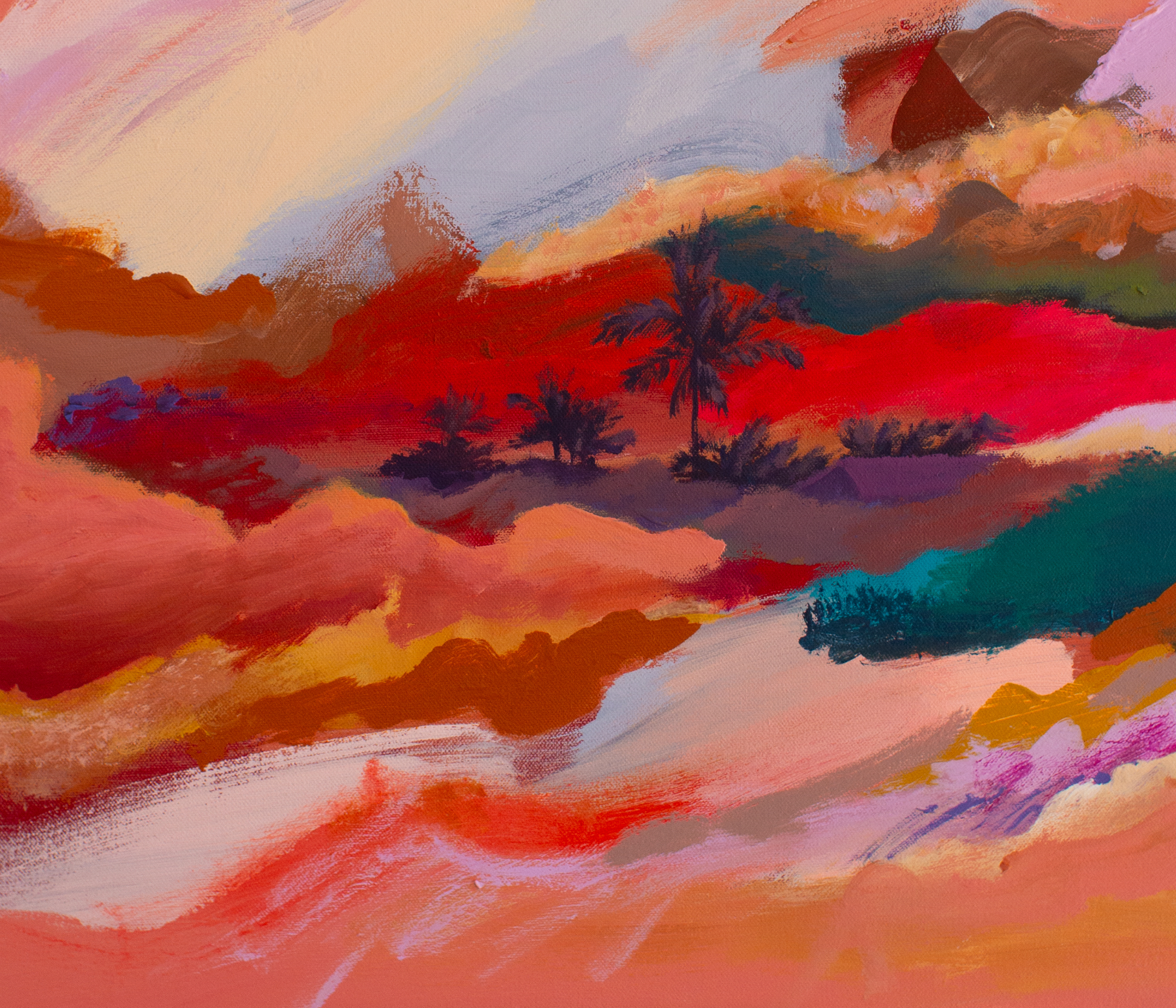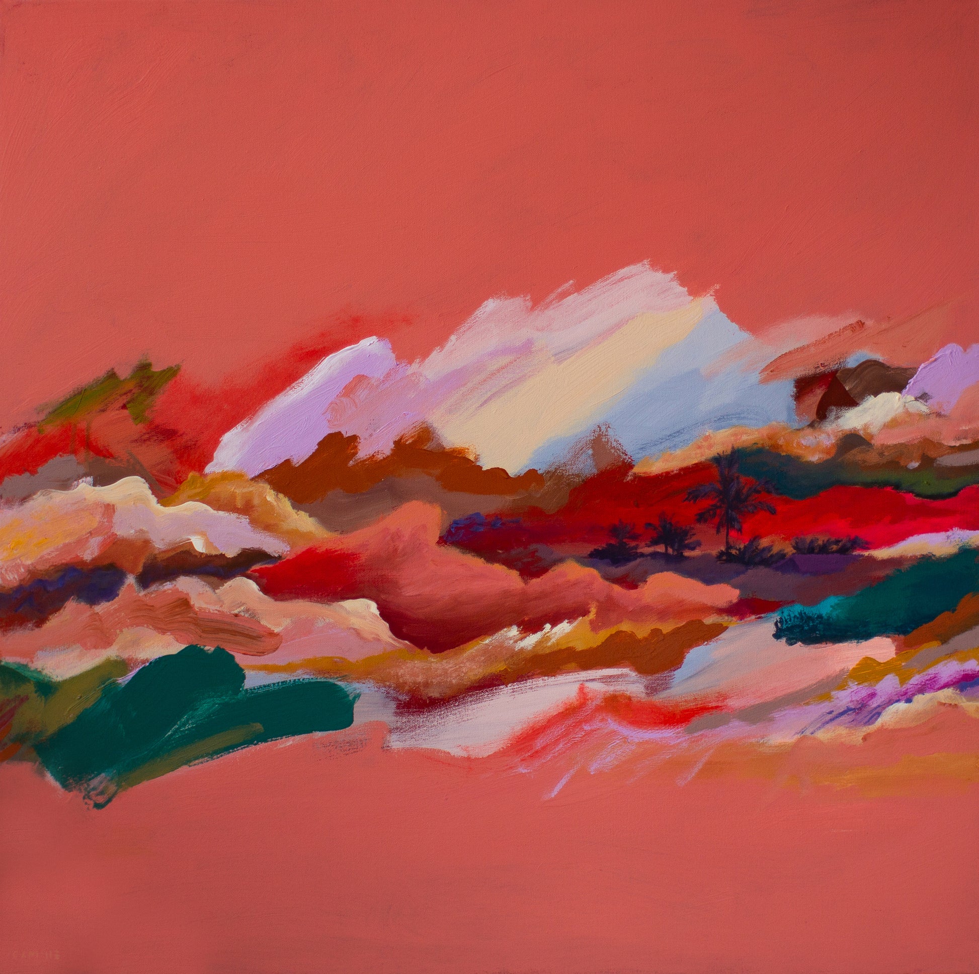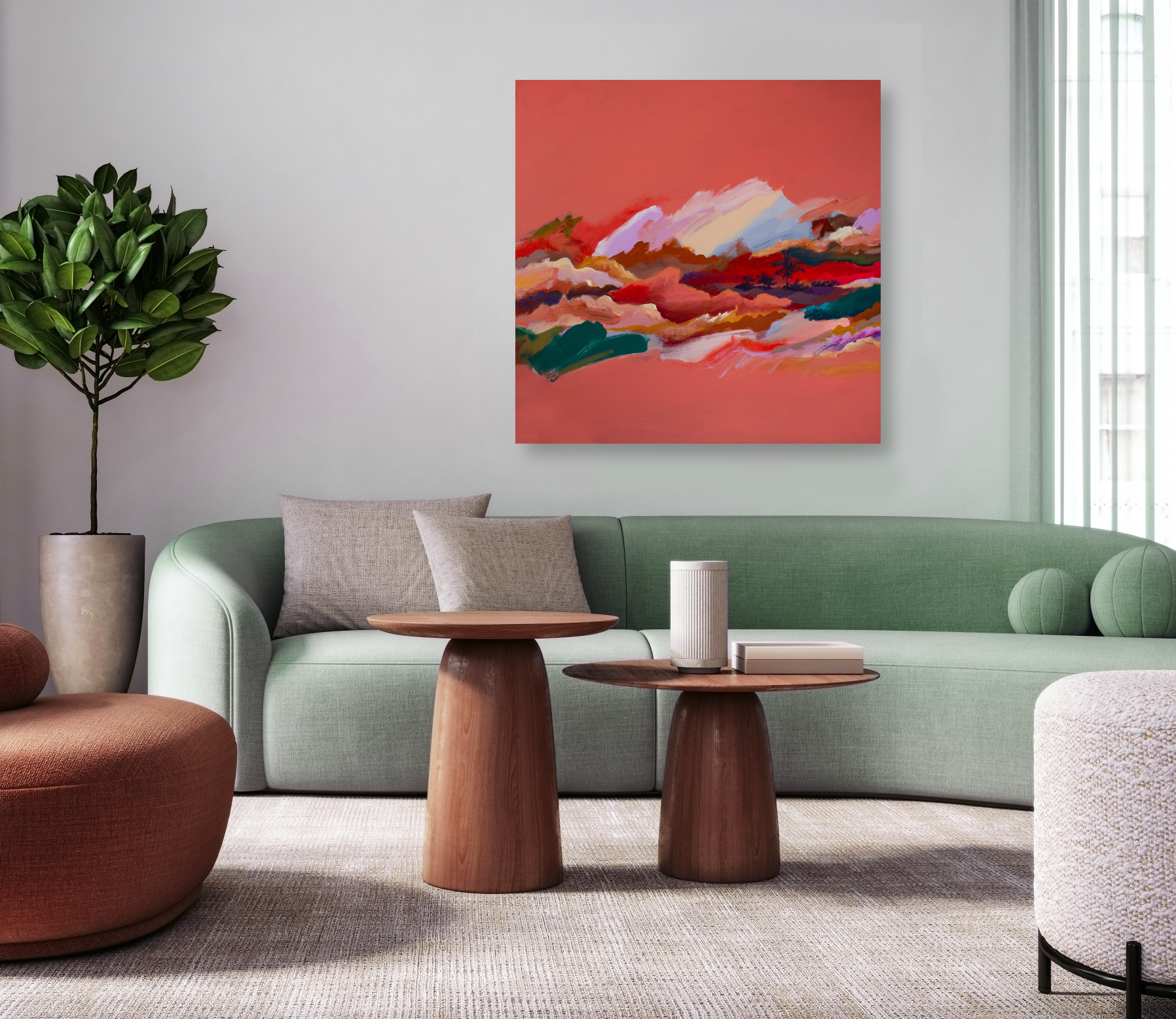 90cm (W) x 90cm (H) x 4cm (D) acrylic on canvas, framed in raw tasmanian oak.