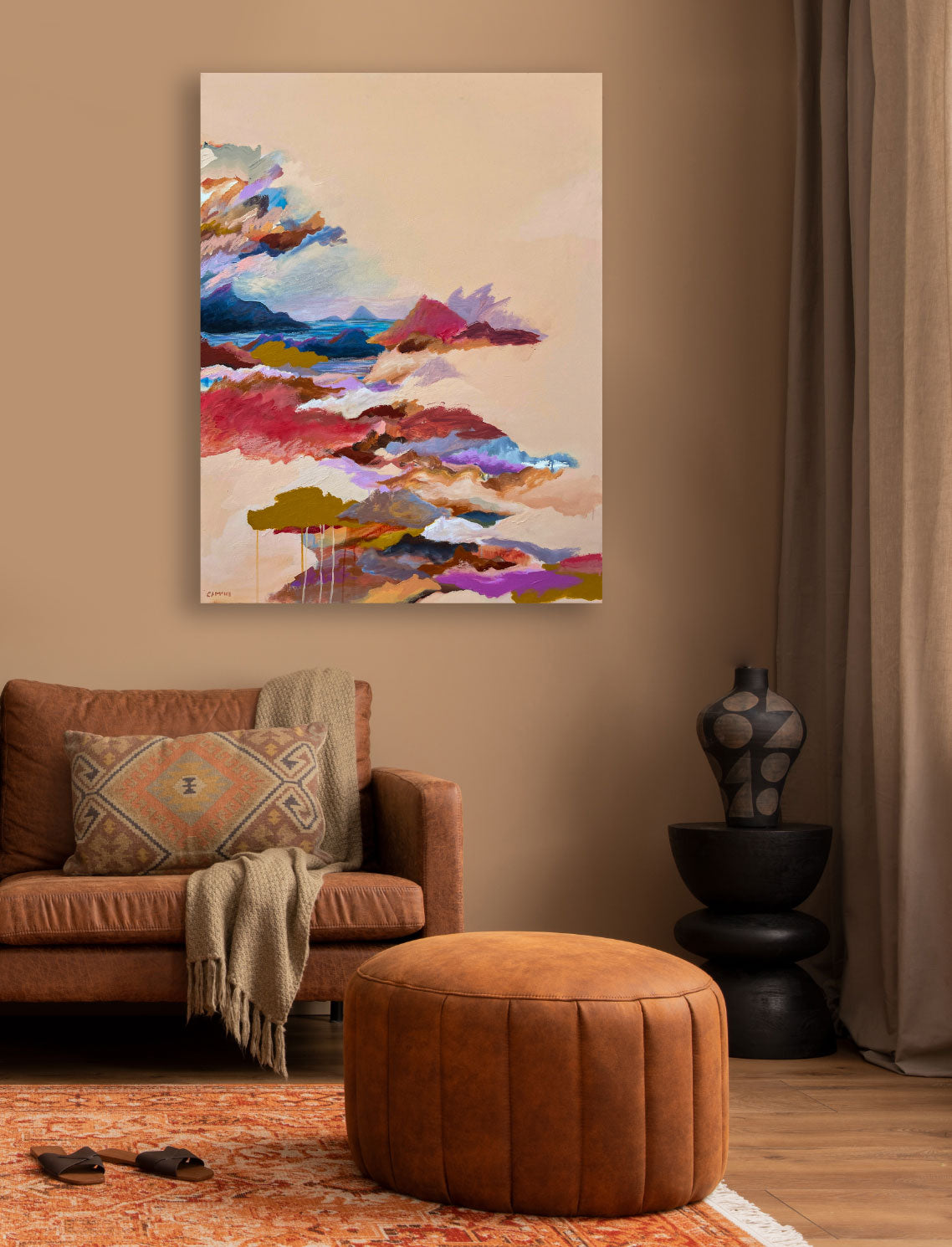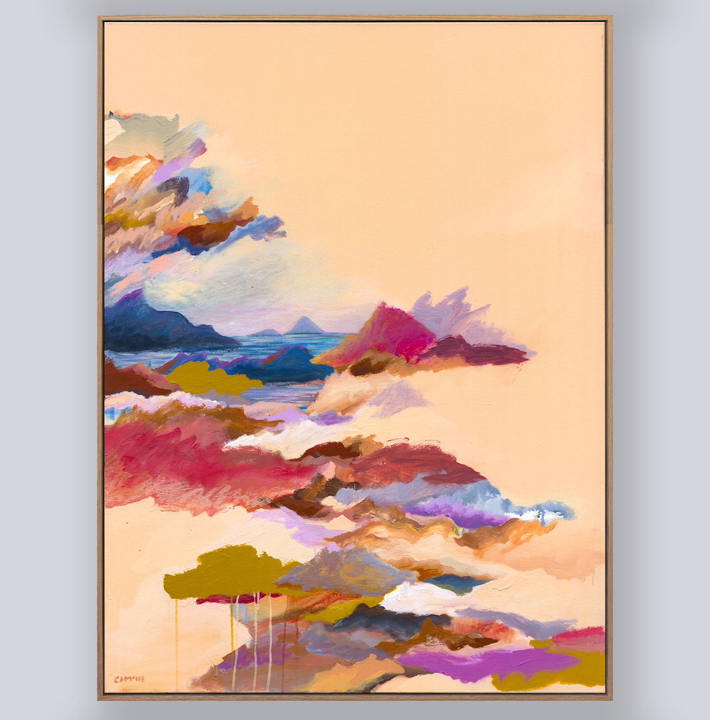 96cm (W) x 126cm (H) x 5cm (D) acrylic on canvas, framed in raw tasmanian oak.